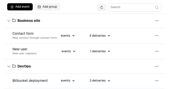 Create events like "deployment success", "contact form submitted", or "server down". Add matching rules to filter incoming messages and organize events into logical groups.